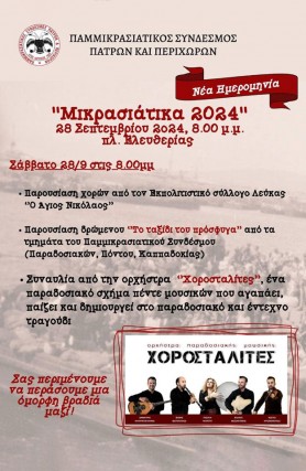 Οι Χοροσταλίτες πλαισιώνουν μουσικά και συνεχίζουν με ένα παραδοσιακό γλέντι τον Παμμικρασιατικό σύνδεσμο Πατρών το Σάββατο 28 Σεπτεμβρίου 2024 στην πλατεία ελευθερίας στην Πάτρα.