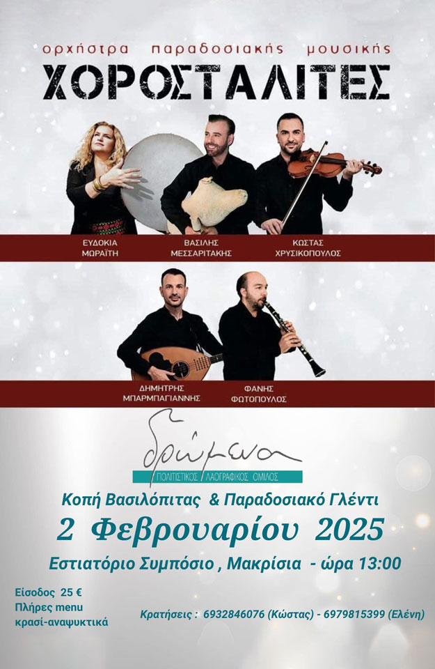 Οι Χοροσταλίτες σε ένα παραδοσιακό γλέντι στην κοπή πίτας του πολιτιστικού συλλόγου δρώμενα στην Μακρίσια στο εστιατόριο "Συμπόσιο" την Κυριακή 2, Φεβρουαρίου 2025.